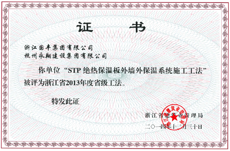 2014年12月30日,浙江國豐集團有限公司“STP絕熱保溫板外墻外保溫系統施工工法”被評為浙江省2013年度省級工法。