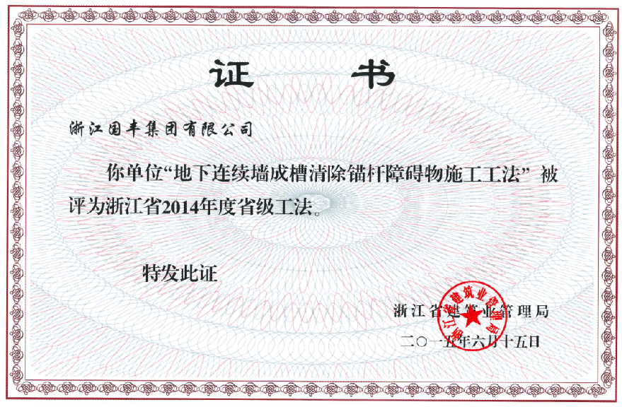 2015年6月15日,浙江國豐集團有限公司“地下連續墻成槽清除錨桿障礙物施工工法”被評為浙江省2014年度省級工法。