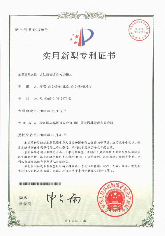 2016年3月,浙江國豐集團有限公司和浙江國豐園林景觀有限公司取得“內貼可卸式止水帶機構”的實用新型專利證書。