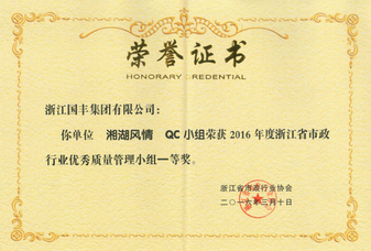 2016年3月10日,浙江國豐集團有限公司湘湖風(fēng)情QC小組榮獲2016年度浙江省市政行業(yè)優(yōu)秀質(zhì)量管理小組一等獎。