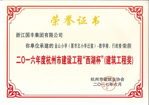 2017年6月,國豐集團承建的金山小學(xué)(原市北小學(xué)遷建)-教學(xué)樓、行政樓工程榮獲2016年度杭州市建設(shè)工程“西湖杯”(建筑工程獎)。