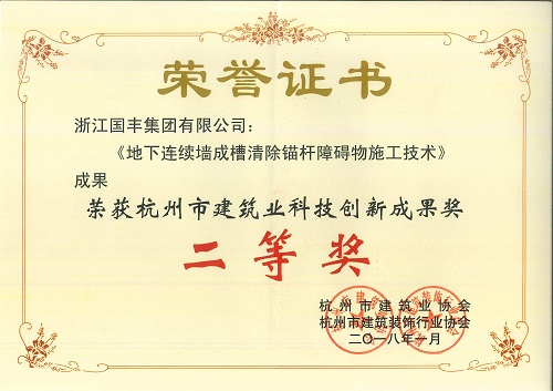 2018年1月,浙江國豐集團有限公司成果《地下連續(xù)墻成槽清除錨桿障礙物施工技術(shù)》榮獲杭州市建筑業(yè)科技創(chuàng)新成果二等獎。