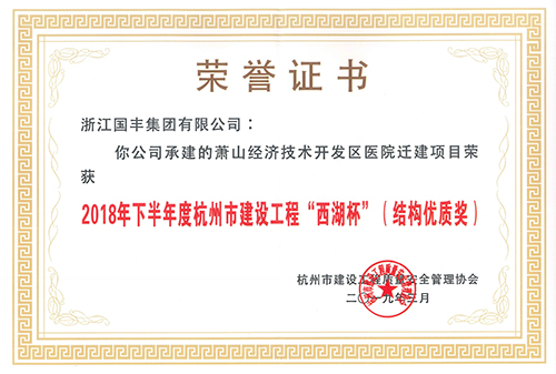 2019年3月,蕭山經濟技術開發區醫院遷建項目榮獲2018下半年度杭州市建設工程“西湖杯”(結構優質獎)。