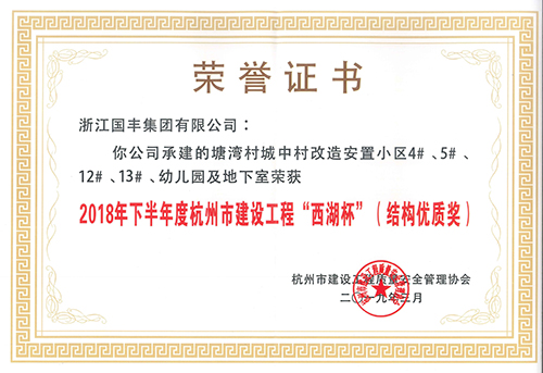 2019年3月,塘灣村城中村改造安置小區4#、5#、12#、13#、幼兒園及地下室榮獲2018下半年度杭州市建設工程“西湖杯”(結構優質獎)。