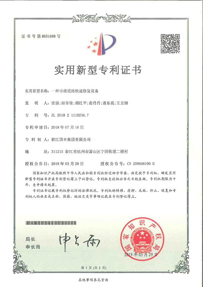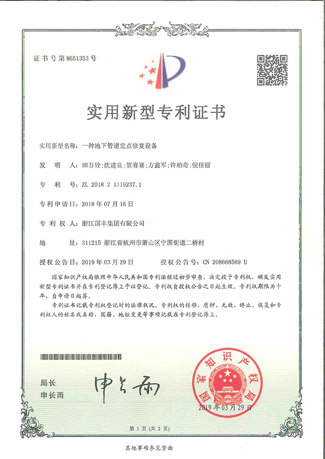 2019年3月,一種地下管道定點修復設備、一種市政道路快速修復設備獲國家實用新型專利。