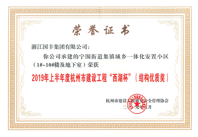 2019年8月,寧圍集鎮城鄉一體化安置小區榮獲2019上半年度杭州市建設工程“西湖杯”(結構優質獎)。