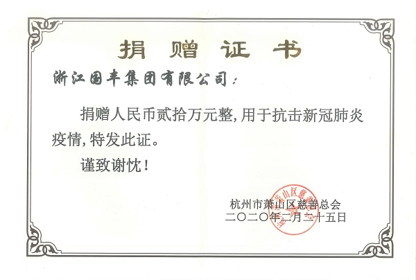 2020年2月,國豐集團向蕭山區慈善總會捐贈人民幣貳拾萬元整,用于抗擊新冠肺炎疫情。