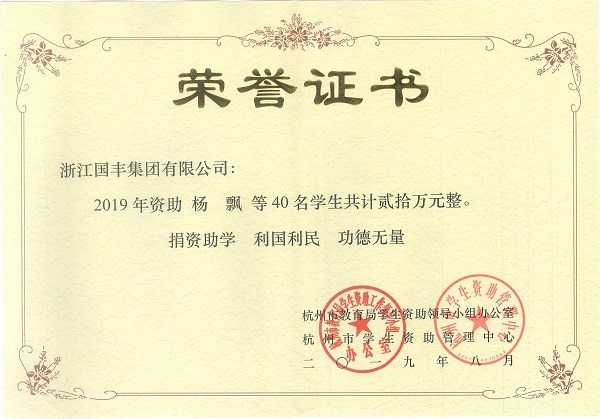 2019年8月,國豐集團資助40名學生共計20萬元整。