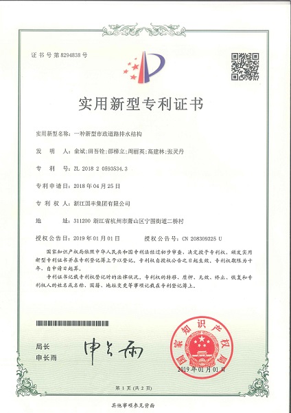2019年1月,一種新型市政道路排水結構獲國家實用新型專利。