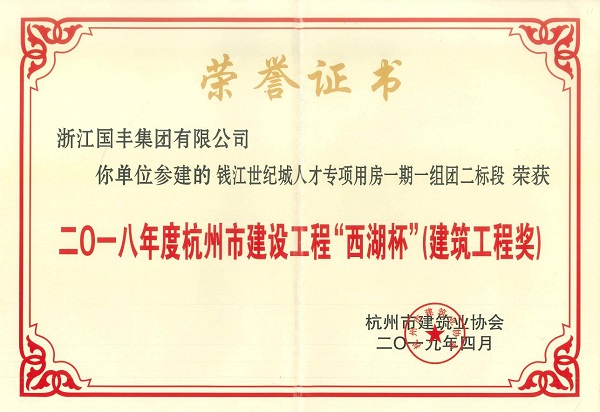 2019年4月,錢江世紀城人才專項用房一期一組團二標段榮獲2018年度杭州市建設工程“西湖杯”建筑工程獎。