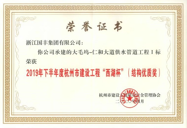 2020年4月,大毛塢-仁和大道供水管道工程I標(biāo)榮獲2019年下半年度杭州市建設(shè)工程“西湖杯”(結(jié)構(gòu)優(yōu)質(zhì)獎(jiǎng))。