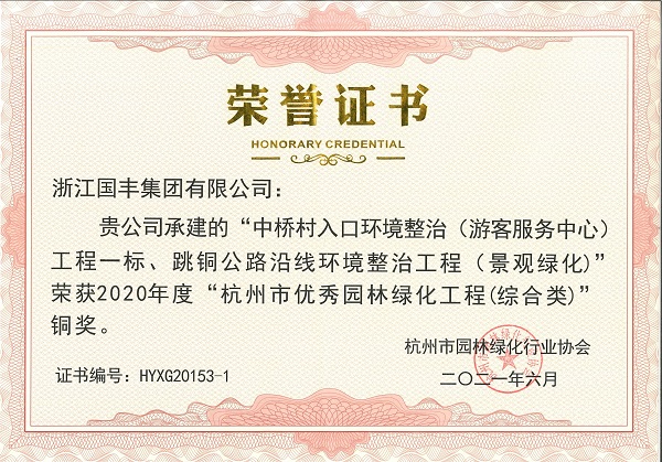 2021年6月,中橋村入口環境整治(游客服務中心)工程一標、跳銅公路沿線環境整治工程(景觀綠化)榮獲2020年度杭州市“優秀園林綠化工程”綜合類銅獎。