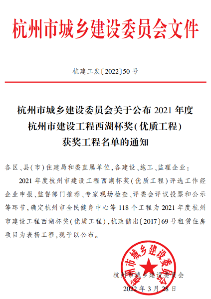 2022年3月,國豐大廈D座、杭州地鐵6號線一期工程SG6-1-4標段等兩個項目榮獲2021年度杭州市建設工程西湖杯獎(優質工程)。