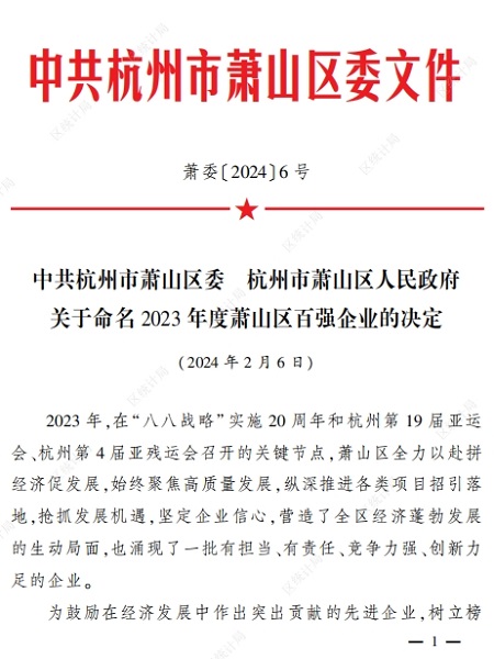 2024年2月,國豐集團榮獲2023年度蕭山區百強企業。