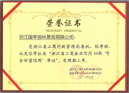 2013年8月29日,浙江國豐園林景觀有限公司被評為“浙江省工商企業(yè)信用AA級‘守合同重信用’單位”