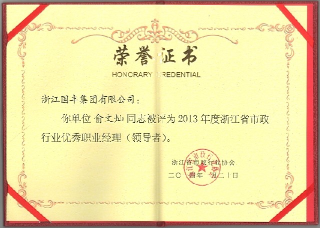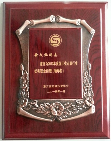 2014年1月20日,俞文燦總經(jīng)理被評為“2013年度浙江省市政行業(yè)優(yōu)秀職業(yè)經(jīng)理(領(lǐng)導(dǎo)者)”。