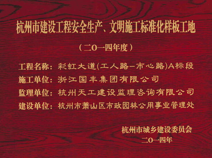 2014年11月4日,浙江國豐集團有限公司承建的彩虹大道(工人路---市心路)A標段工程榮獲杭州市建設(shè)工程安全生產(chǎn)、文明標準化樣板工地。