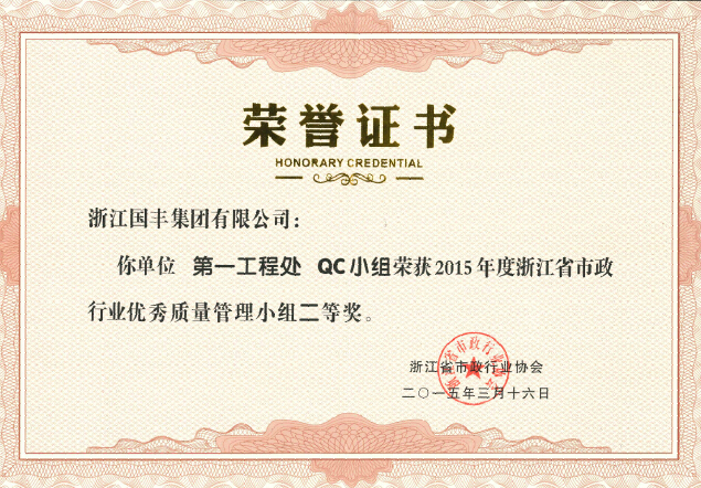 2015年3月16日,浙江國豐集團有限公司第一工程處QC小組分別榮獲2015年度浙江省市政行業優秀質量小組二等獎、三等獎。