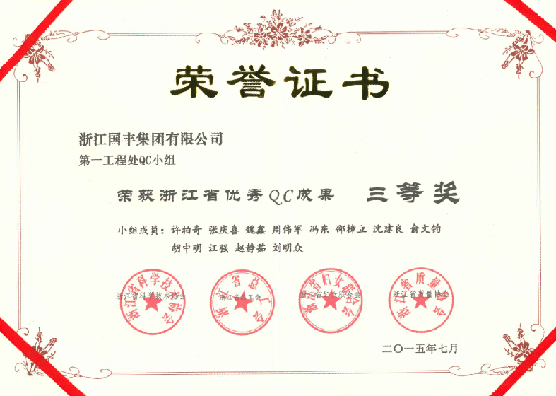 2015年7月6日,浙江國豐集團(tuán)有限公司第一工程處QC小組榮獲浙江省優(yōu)秀QC成果三等獎。