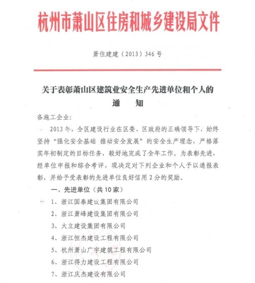 2013年10月29日,俞文燦總經理被評為“2013年度杭州市市政行業優秀職業經理(領導人)”。