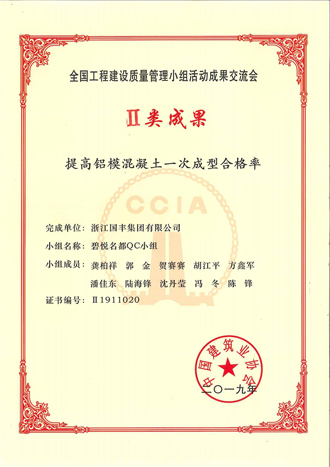 2019年6月,碧悅名都QC小組《提高鋁模混凝土一次成型合格率》成果,榮獲“全國工程建設質量管理小組活動Ⅱ類成果”。