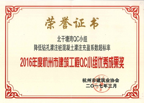 2017年3月,浙江國豐集團有限公司北干塘灣QC小組“降低鉆孔灌注樁混凝土灌注充盈系數超標率”榮獲2016年度杭州市建筑工程QC小組優(yōu)秀成果獎。