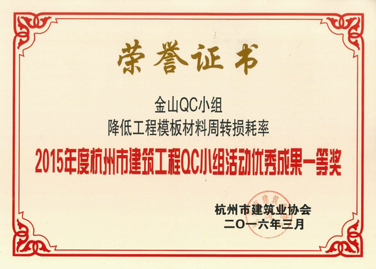 2016年3月,浙江國豐集團有限公司金山QC小組“降低工程模板材料周轉損耗率”榮獲2015年度杭州市建筑工程QC小組活動優秀成果一等獎。