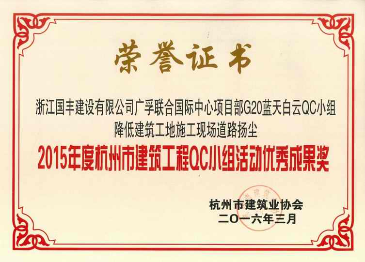 2016年3月,浙江國豐建設有限公司廣孚聯合國際中心項目部G20藍天白云QC小組“降低建筑工地施工現場道路揚塵”榮獲2015年度杭州市建筑工程QC小組活動優秀成果獎。