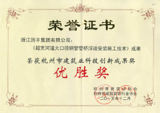 2015年12月28日,浙江國豐集團有限公司“超寬河道大口徑鋼管管橋浮運安裝施工技術”榮獲杭州市建筑業科技創新成果優勝獎。