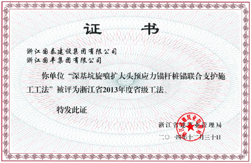 2014年12月30日,浙江國豐集團有限公司“深基坑旋噴擴大頭預應力錨桿樁錨聯合支護施工工法”被評為浙江省2013年度省級工法。