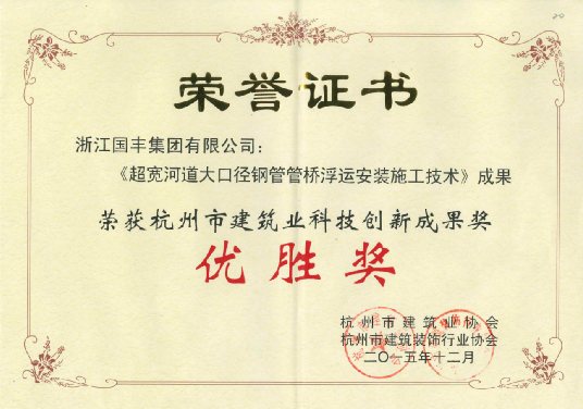 2015年12月28日,浙江國豐集團有限公司《超寬河道大口徑鋼管管橋浮運安裝施工技術》成果榮獲杭州市建筑業科技創新成果優勝獎。