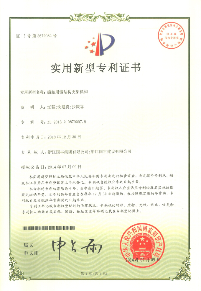 2014年10月11日,浙江國豐集團有限公司和浙江國豐建設有限公司取得“船舶用鋼結構支架機構”的實用新型專利證書。