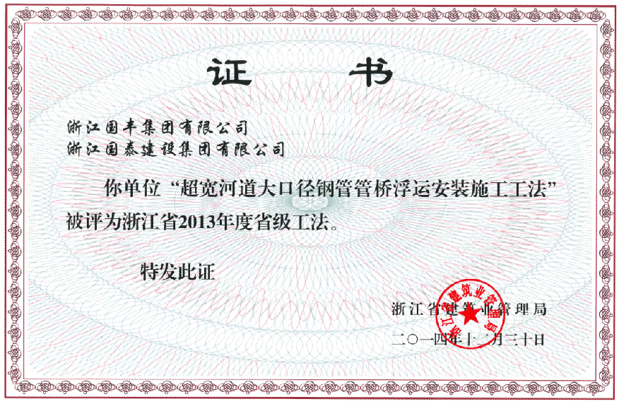 2014年12月30日,浙江國豐集團有限公司“超寬河道大口徑鋼管管橋浮運安裝施工工法”被評為浙江省2013年度省級工法。