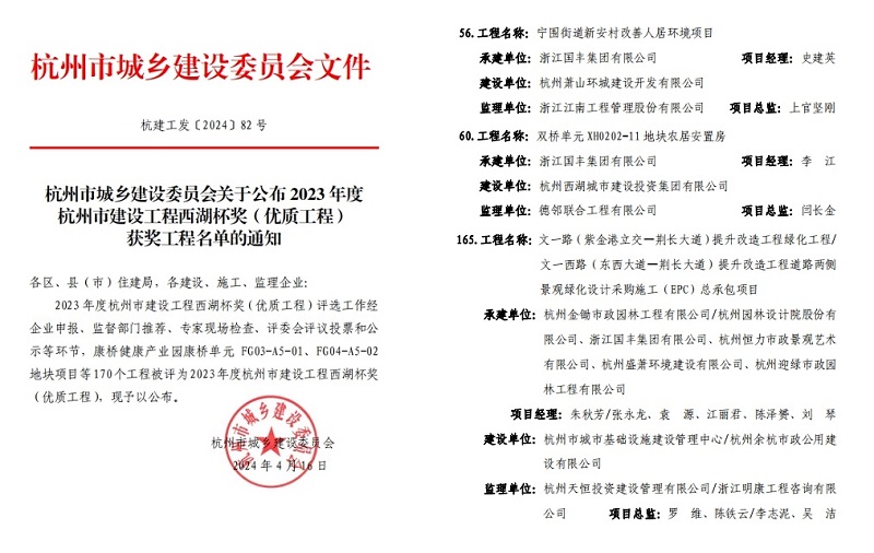 近日,杭州市城鄉建設委員會公布了2023年度杭州市建設工程西湖杯獎 (優質工程 )獲獎工程名單,我集團承建的寧圍街道新安村改善人居環境項目、雙橋單元XH0202-11地塊農居安置房、文一西路(東西大道 —荊長大道)提升改造工程道路兩側景觀綠化設計采購施工(EPC)總承包三個項目榜上有名!