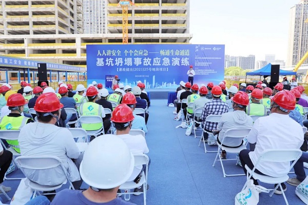 5月 16日下午,在全國第 23個安全生產月到來之際,蕭政儲出(2021)25號地塊項目在現場舉行了“人人講安全,個個會應急——暢通生命通道”基坑坍塌事故應急演練活動。區住建局黨委委員、副局長胡彬峰,湘湖國家旅游度假區黨工委委員楊曉峰,浙江湘旅控股集團有限公司黨委書記、董事長、總經理楊波,浙江湘旅綠色開發建設有限公司總經理周建江、監理單位負責人、公司生產副總沈建良、公司工程部應急小組及相關基礎階段項目人員等參與觀摩此次演練。