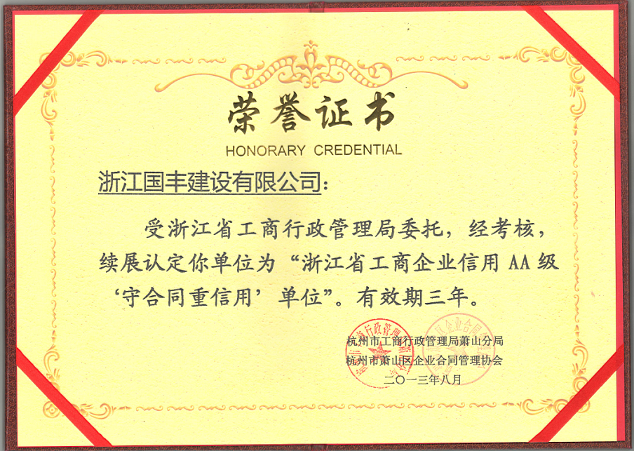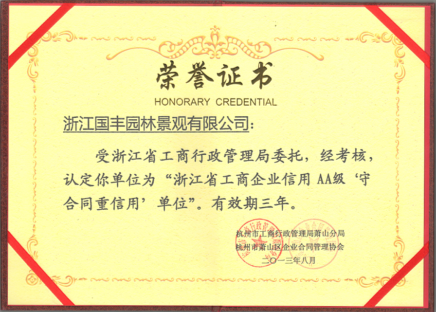 近日,我集團下屬子公司“浙江國豐園林景觀有限公司”和“浙江國豐建設有限公司”通過了杭州市工商行政管理局的考核,獲得了“浙江省工商企業AA級‘守合同重信用’單位”的榮譽稱號。