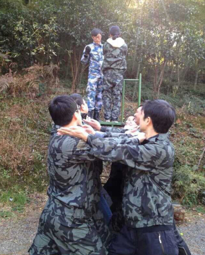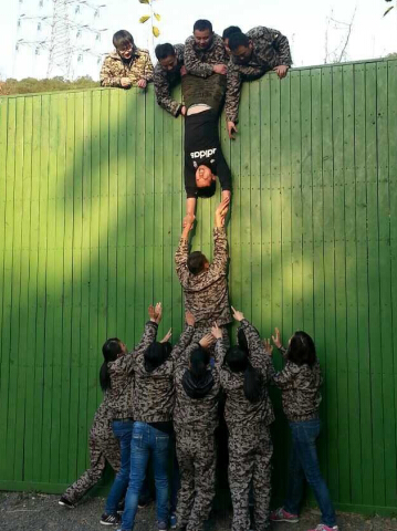 隨后我們以隊伍對抗的形式完成了卓越圈、信任背摔、真人CS等團隊項目,給我們印象最深的是最后一個項目“畢業墻”,此項目考驗了我們團隊能否合理利用資源,是否具備相互配合、互相溝通的能力。一堵4米的高墻,光滑、沒有任何工具,要求所有的隊員都翻越過去,才算勝利。為達成團隊目標,每個人都相互支持與合作,團隊精神在這里得到完美體現。我們為第一個爬上墻頭,為堅持救上一個又一個隊友而感動!為在下面咬著牙甘當基石,讓一個個隊友踏著自己的肩頭而感動!為隊友的安全,將自己的雙手高高舉起而感動!在很多人眼里是根本不可能完成的任務,但是在強大的團隊力量下,整個團隊僅用了10分鐘,就完成了全部人員成功翻越垂直墻的任務。