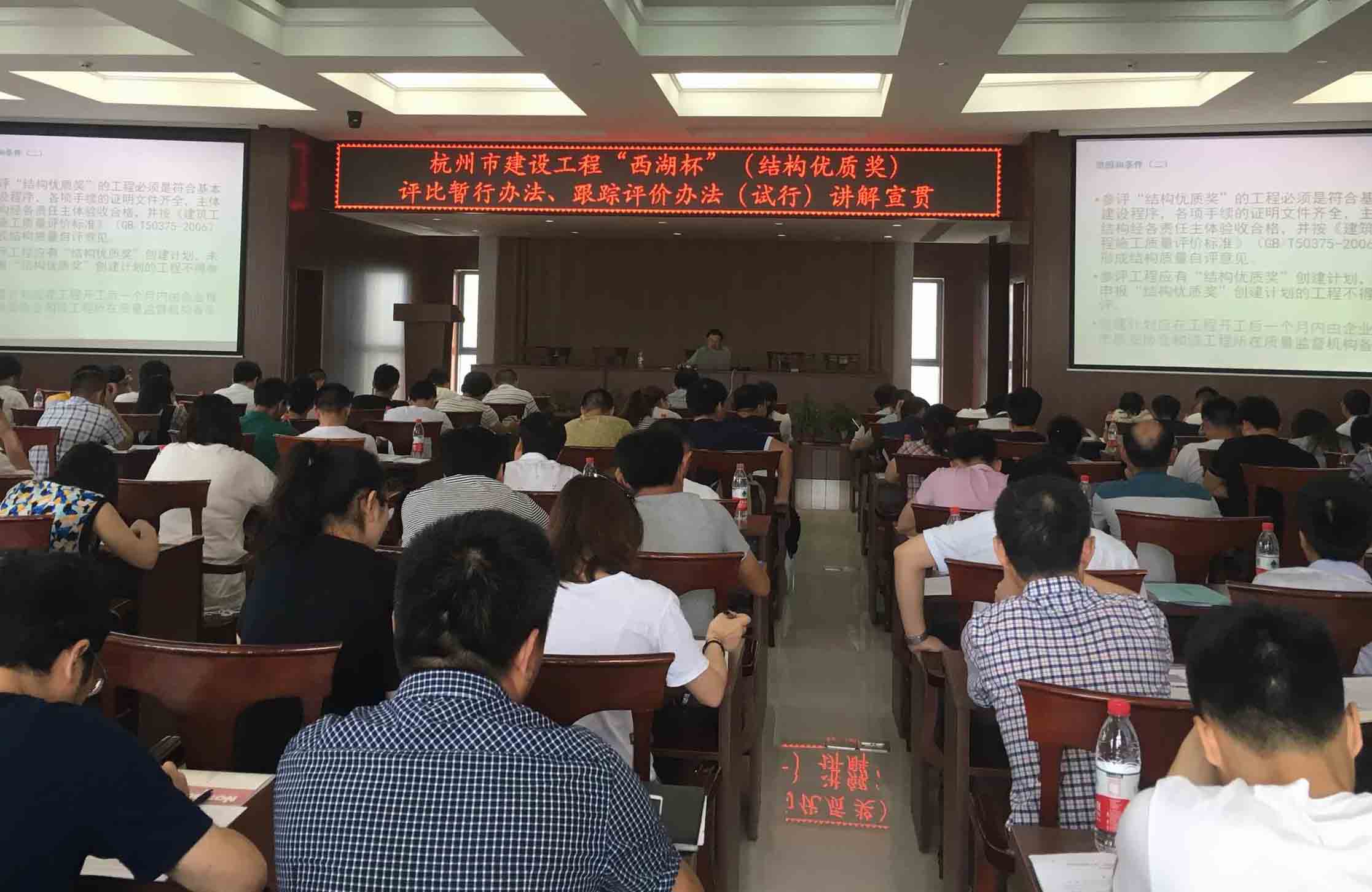 2016年6月21日,杭州市建設工程“西湖杯”(結構優質獎)評比暫行辦法、跟蹤評價辦法(試行)講解宣貫在杭召開。杭州市房屋建筑工程和市政工程施工施工企業有關人員以及監理單位項目總監、總監代表參加。公司工程部、直屬工程處派員參加。