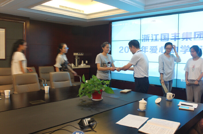 8月18日下午,杭州市教育局學生資助部部長王君波和副部長胡敏華,學生資助領導小組辦公室的吳喜勝老師,蕭山教育局計財科孫潔老師,及公司常務副總田利剛、辦公室主任羅杰與本次受資助的10位大學生歡聚一堂,舉辦了一場溫馨的資助儀式。