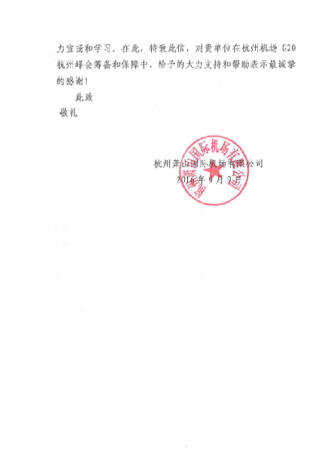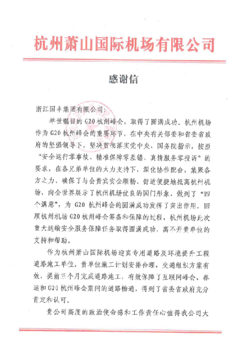 近日,我公司收到了杭州蕭山國際機場有限公司送來的感謝信。信中高度贊揚了我公司在杭州蕭山國際機場迎賓專用道路及環境提升工程道路工程項目施工過程中合理安排施工計劃,科學編制交通組織方案,提前三個月完成道路施工,保障了G20峰會與會貴賓安全順暢、舒適便捷地抵離杭州機場,向全世界展示了杭州機場優良的國門形象,做到了“四個滿意”,為G20杭州峰會的圓滿成功發揮了突出作用。