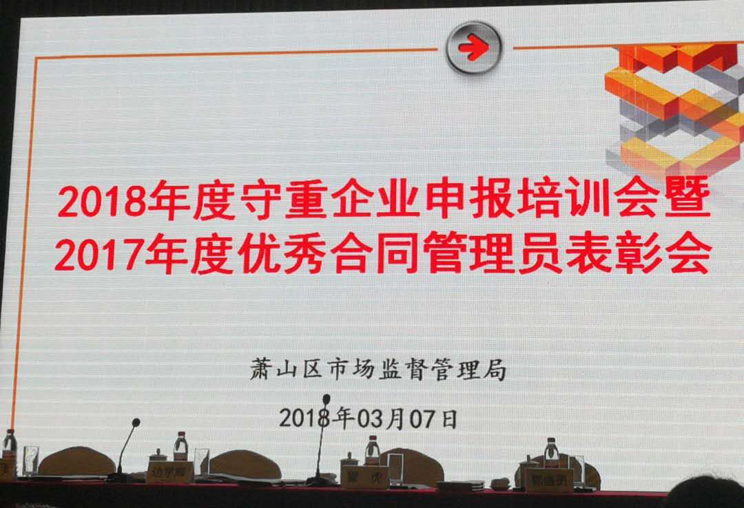 2018年3月7日下午,蕭山區市場監督管理局2018年度守重企業申報培訓暨2017年度優秀合同工管理員表彰會議在蕭山太虛湖假日酒店召開,我公司派員參加了會議。