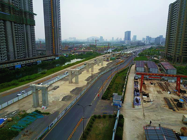 我公司承建的風情大道改造及南伸(金城路-湘湖路)工程—彩虹大道(區(qū)界—青年路)二期工程(高架橋)項目主線高架橋為雙向六車道,全長1601m,橋面標準段寬度25m,設計車速80km/h。橋梁下部結構為樁承臺基礎、雙柱式H型橋墩,上部結構為現(xiàn)澆箱梁。