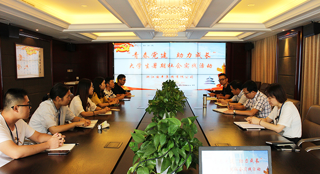 今年暑假由蕭山區(qū)委組織部、區(qū)人社局、區(qū)教育局、團(tuán)區(qū)委共同舉辦的“青春黨建•助力成長”大學(xué)生暑期實(shí)踐活動(dòng)正式啟動(dòng)。我公司作為用人單位積極參與此次活動(dòng),為優(yōu)秀大學(xué)生提供了多個(gè)實(shí)踐鍛煉崗位。7月20日上午,公司以此為主題召開座談會(huì),常務(wù)副總田利剛、黨總支副書記汪強(qiáng)、辦公室主任羅杰、副主任王秀萍及參與暑期實(shí)踐的大學(xué)生參加了本次會(huì)議。
