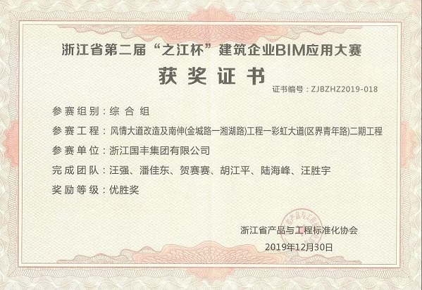 歲末年初,喜報頻傳。我集團《風情大道改造及南伸(金城路—湘湖路)工程—彩虹大道(區界青年路)二期工程BIM技術應用》榮獲浙江省第二屆“之江杯”建筑企業BIM應用大賽“綜合組——優勝獎”。
