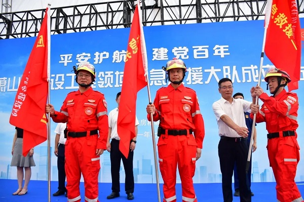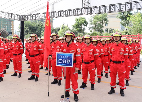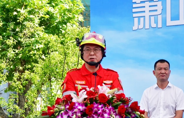 區住建局黨委書記、局長邵生華為應急救援大隊授旗。